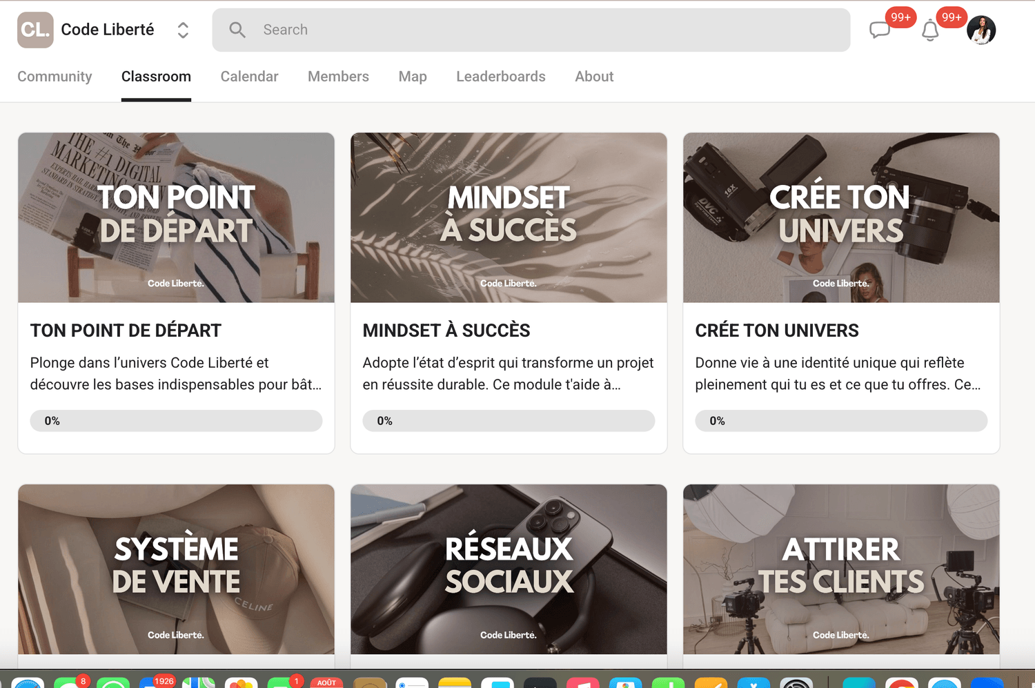 Tu accèdes à une interface claire, organisée par modules et leçons.